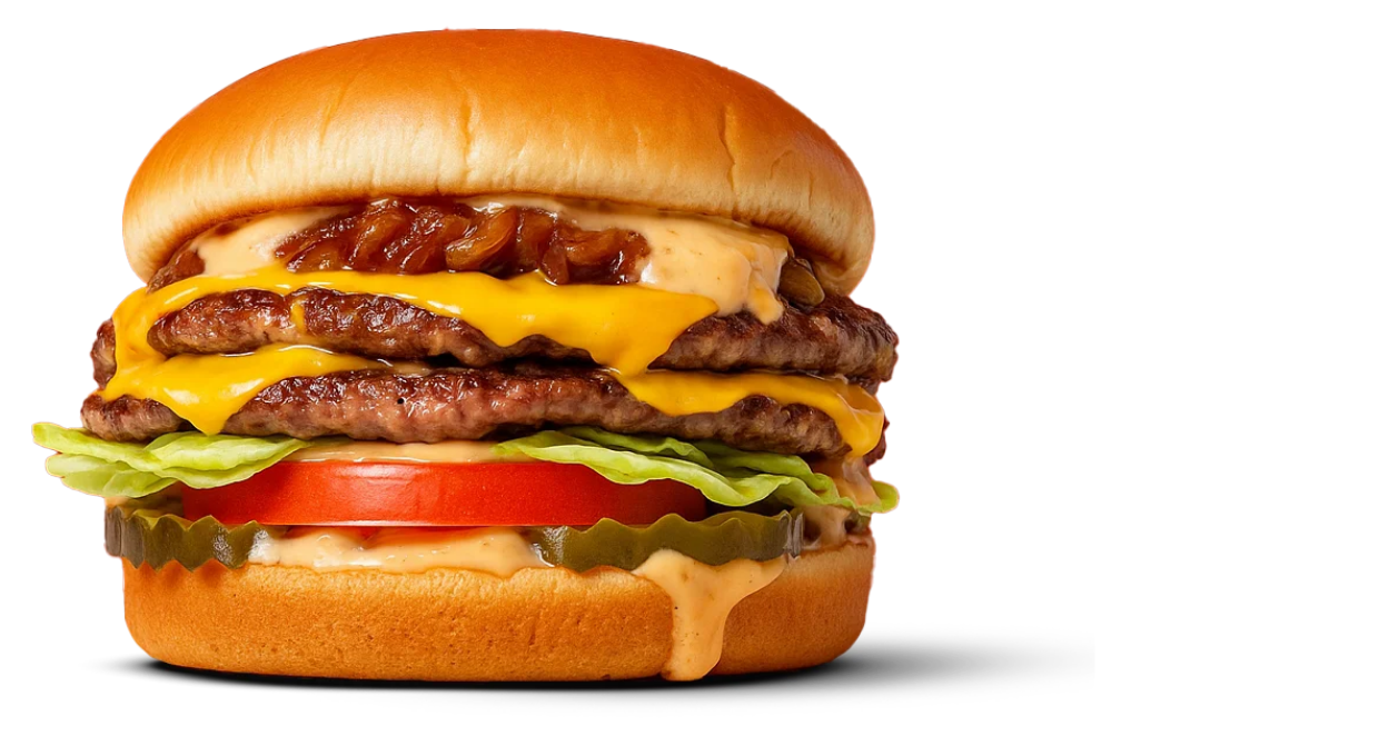 Two All-Beef Mustard Cooked Patties, Lettuce, Tomato, Grilled Onions, Cheese and Extra Go Spread.